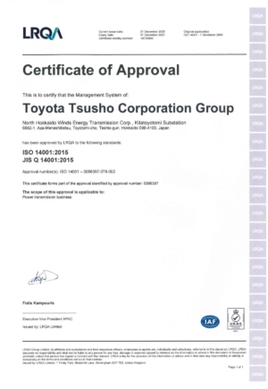 環境保全に関する世界共通の標準規格である環境マネジメントシステム(ISO14001)に沿って継続的な環境保全活動を推進してまいります。